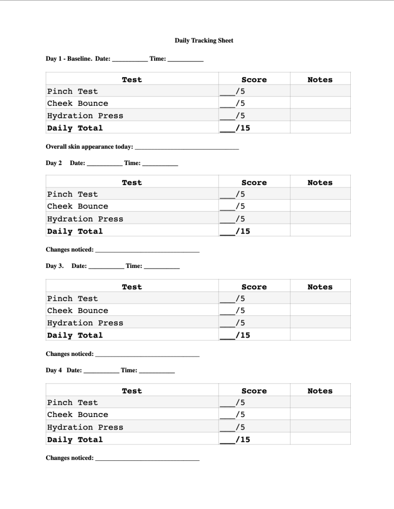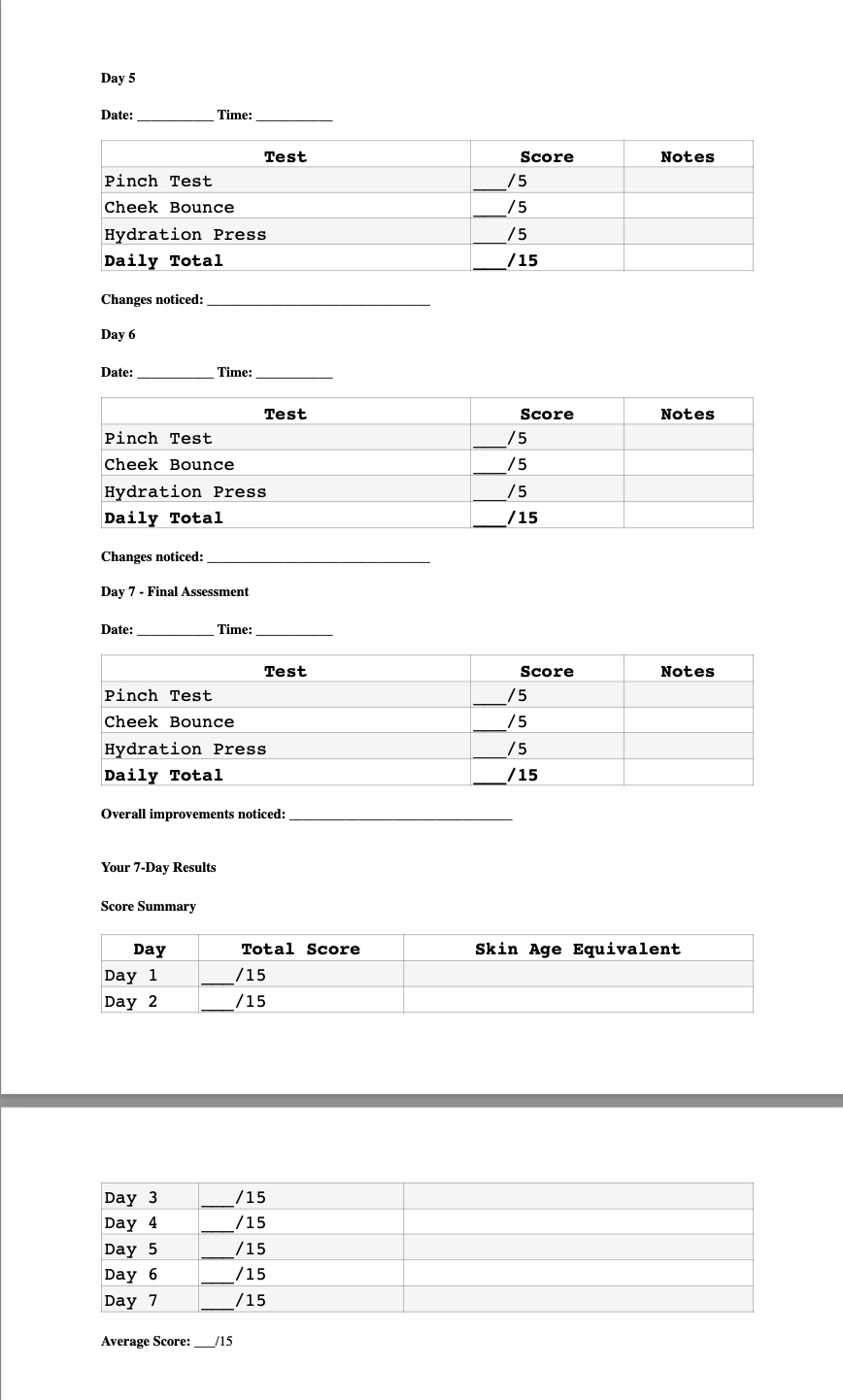 Over the next 7 days, you’ll perform three simple tests each day to measure your skin’s elasticity, hydration, and overall firmness. Each test takes less than 2 minutes and can be done in front of your bathroom mirror.